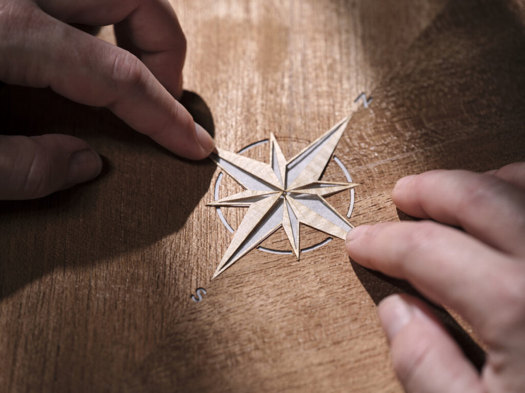 Open Pore Teak covers the rear Waterfall, rear centre console lid and door panels throughout the collection. It is the same wood used on yacht decks, brought in here for its feel and its honesty as a material. On the rear Waterfall, a marquetry compass motif is laid into the teak, made from more than 40 individual pieces of veneer in Sycamore, Teak, Ash and Black Bolivar, each one cut and placed by hand.