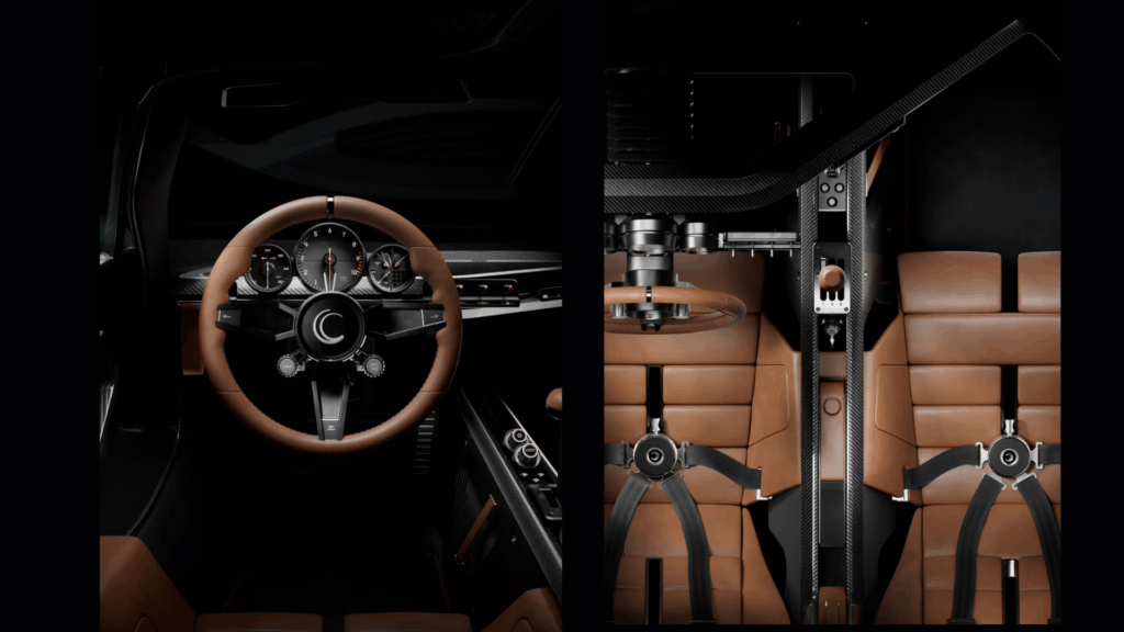 The cabin takes a racing-inspired approach, with carbon fibre at its core and titanium and aluminium switchgear throughout. Connolly leather and Alcantara trim are bespoke, while analogue instruments keep the rev counter front and centre. Fixed seats integrate with the safety cell and feature Schroth four-point belts, with adjustable pedals, steering column, and gear lever ensuring every driver can find the perfect position. Practical touches include a 110-litre front boot, four-wheel lift, reversing camera, Brembo carbon-ceramic brakes, and 21-inch alloy or carbon fibre wheels.