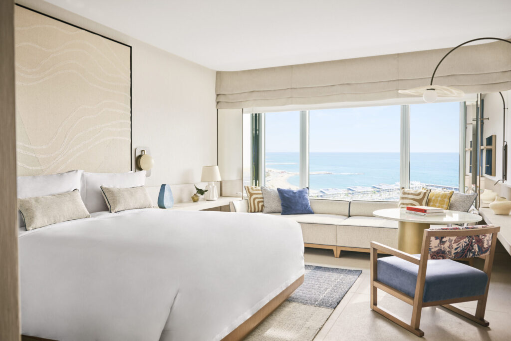 Back at Hotel Arts Barcelona, the experience continues with a guaranteed upgrade to a Panorama Sea View Room. Set within the hotel’s iconic 44-storey glass and steel tower, designed by architect Bruce Graham, the newly redesigned interiors balance contemporary finishes with carefully curated works by Catalan and Spanish artists. Floor-to-ceiling windows allow guests to enjoy sweeping views of the Mediterranean, the city skyline, and Port Olímpic’s marina.