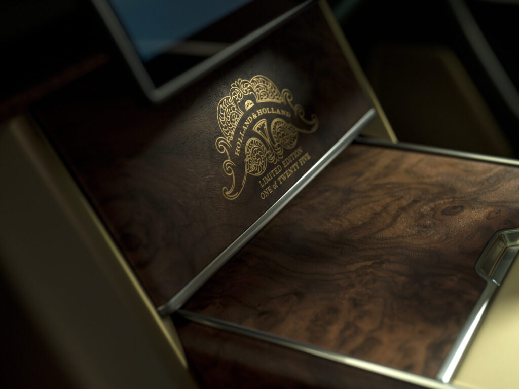 Step inside and the level of detail becomes immediately apparent. The ‘Royal’ scroll unfurls across high-touch stainless steel elements, whilst open pore French walnut veneers provide both organic beauty and a tactile connection to the edition’s inspiration. Both front and rear centre consoles feature a decorative golden inlaid crest from the gunmaker, the former confirming the edition’s scarcity with ‘Limited Edition: One of Twenty-Five’, the latter housing a champagne cooler and pair of flutes.