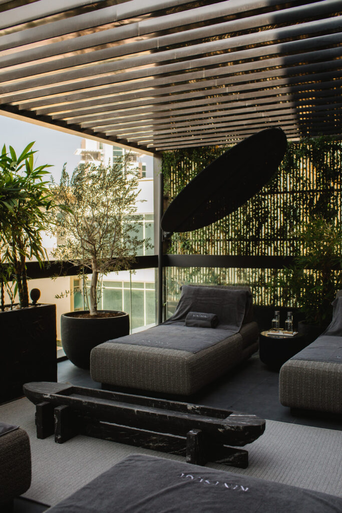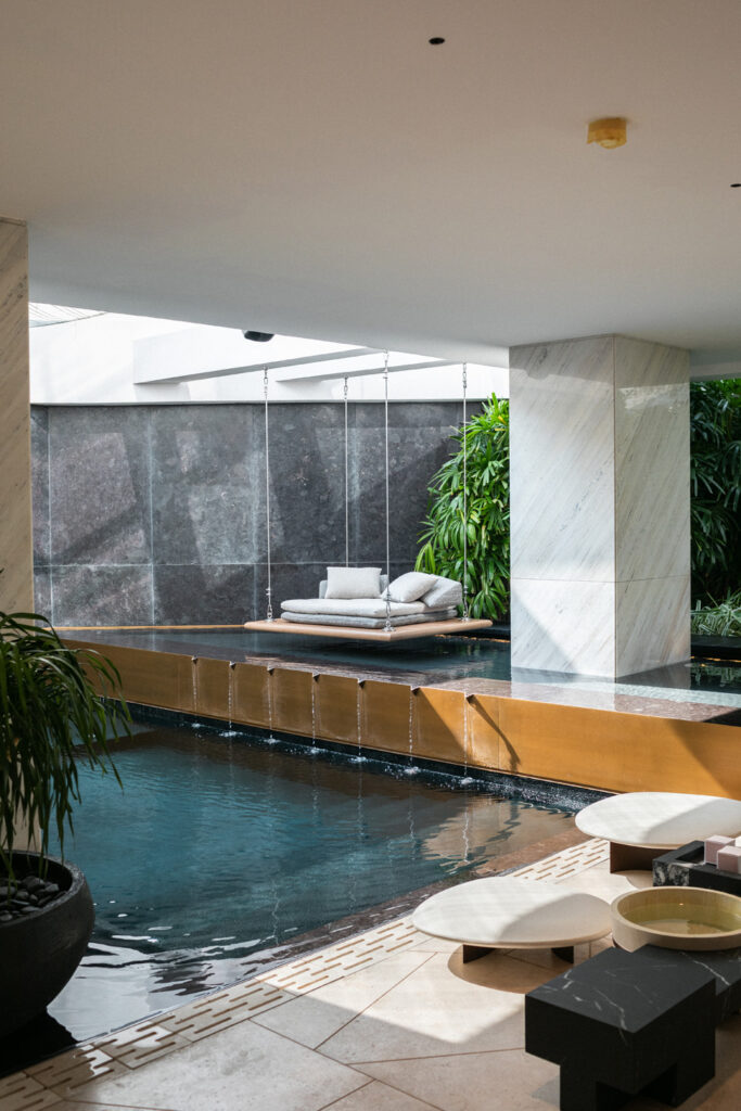 The townhouse itself functions as a vertical wellness journey. The lower levels house traditional hydrotherapy facilities: varying scented hammam experiences, a Japanese onsen bath, an infrared sauna incorporating salt therapy, and a black obsidian sauna designed to activate the limbic system. A small pool and Japanese-styled gardens provide contemplative spaces between treatments.