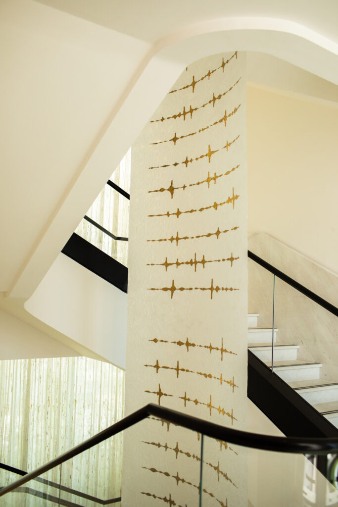 The library occupies a quiet corner, stocked with titles like ‘Healing is the New High’ and ‘All You Need is Rest’. I found myself drawn to the Happiness Room, a small but perfectly conceived space featuring musical instruments and affirmation cards. Throughout the building, artwork from regional female artists creates visual harmony, including Lauren Baker’s impressive 25-metre installation ‘Letter to the Universe’, golden sound waves of chakra frequencies painted over the course of a year following meditation.