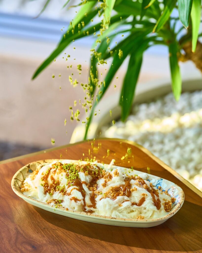 Gazleyah, or cotton candy, concluded the meal in a way we hadn’t anticipated. Muhalabia, a traditional Middle Eastern milk pudding, was presented with cotton candy and caramel sauce. The muhalabia itself was delicate, with a subtle sweetness and creamy texture that melted on the tongue. The cotton candy, which could have been a gimmick, actually worked, dissolving into sugary wisps that combined with the caramel sauce to create layers of sweetness and texture. This was playful without being frivolous, unexpected without being bizarre. It felt like a dish with roots in tradition that had been given a contemporary twist, which suited the restaurant’s overall approach.