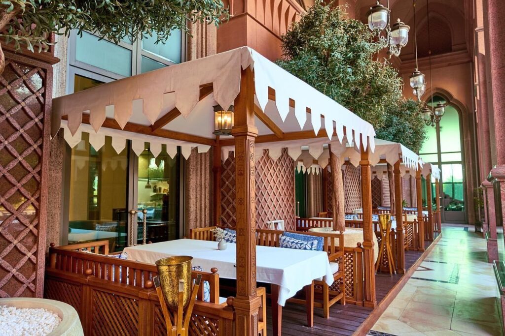 Lebanese Terrace succeeds in creating an environment that feels authentically Lebanese whilst sitting firmly within the Emirates Palace grounds. The design elements work together rather than competing. Olive trees provide vertical interest and shade, their silvery leaves catching the light. Stained-glass windows filter the sunlight during day service, creating patterns on the tables. The aquamarine walls reference the Mediterranean without being literal or heavy-handed.