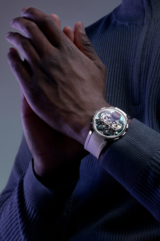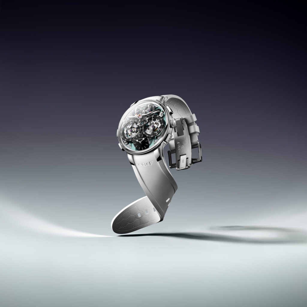 At the core of the EVO case is MB&F’s FlexRing shock-absorption system, positioned between the case and movement. This annular dampener cushions impacts along both vertical and lateral axes, protecting Stephen’s intricate mechanism during activities that would challenge conventional chronographs. The absence of a traditional bezel opens sight lines to the domed sapphire crystal, treated with anti-reflective coating on both surfaces. Super-LumiNova enhances legibility across all displays, including the tilted time dial at six o’clock, carried over from the classic Legacy Machine edition.