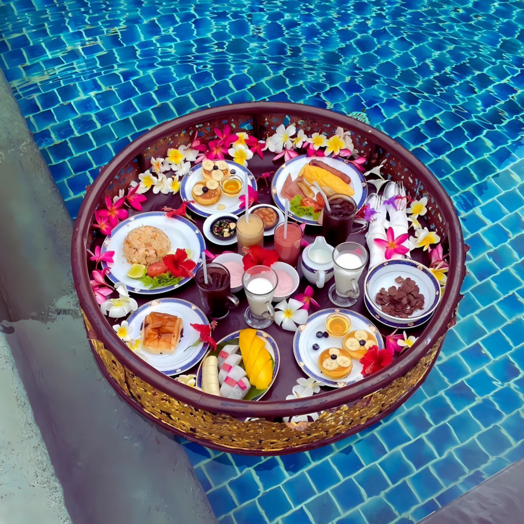One of the highlights at Ammatara Pura is the floating breakfast. Served in the privacy of your villa’s pool, the carefully curated spread features fresh fruits, pastries, cheeses, and perfectly brewed coffee or tea, all presented on a beautifully arranged floating tray. It’s a luxurious, serene way to start the day, savoring each bite while soaking up the morning sun, listening to the gentle lapping of the water, and enjoying uninterrupted views of the sea.