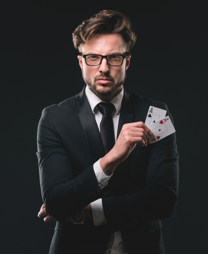 Studio portrait of young man with glasses wearing suite and necktie and holding aces of clubs and hearts. Black background.